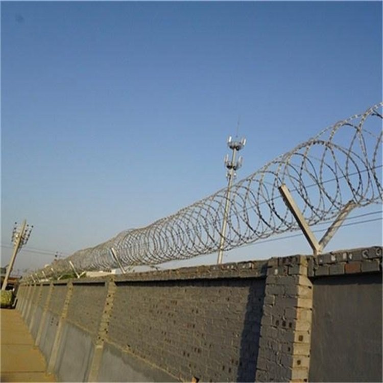 刀刺網的樣式一般分為不銹鋼和鍍鋅這2種材質,常用鍍鋅的,但是在一些天氣條件比較惡劣的條件下(比如日照時間長,或白天晚上溫度相差大,還有是陰天多雨潮濕的地域),還是建議使用不銹鋼材質。安裝間距不宜少于250px,圈距排列應均勻,刀片形式宜為BTO-22(芯線直徑2.5mm±0.1mm,刀片厚0.5mm±0.05mm,刀片長22mm±1mm,刀片寬度15mm±1mm,刀片間距36mm±1mm),用于支撐刀刺網的支架伸出刀刺網長度不應大于50)mm;