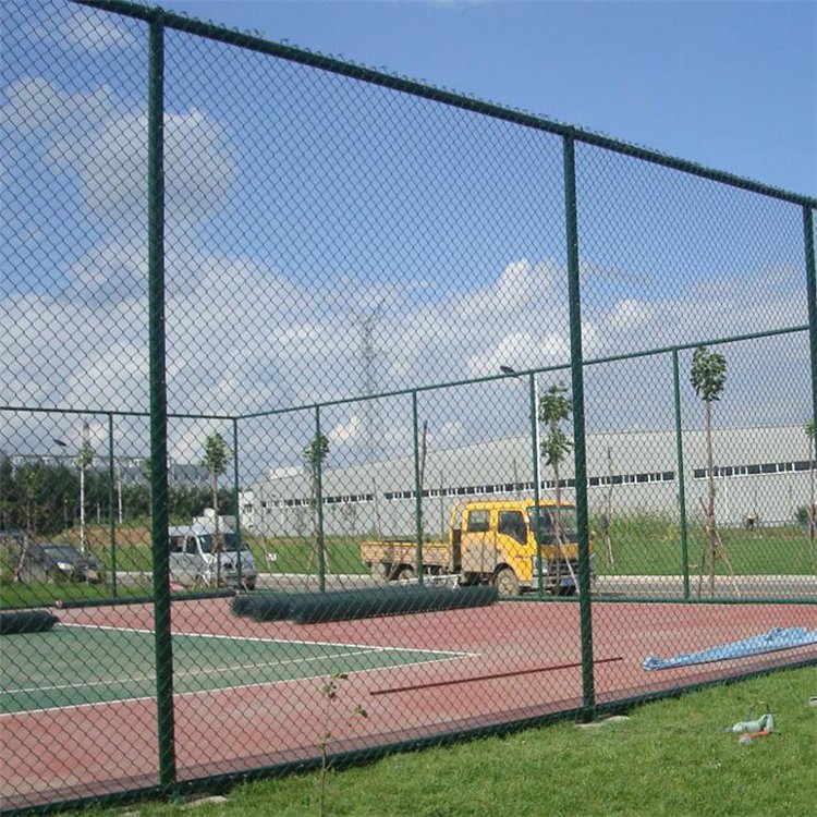 球場圍網各組成部分的表面處理:圍網采用PE/PVC包塑絲,立柱、邊框采用噴塑、浸塑處理。網體高大不易攀爬,顏色亮麗,防腐性好,網面有彈性抗沖擊力強,不易因外力撞擊而變形, 體育球場圍網材質:優質低碳鋼絲,編織焊接。