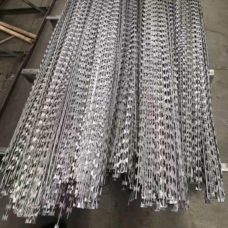1、制作刀片:選用優(yōu)質Q195L熱鍍鋅帶鋼(或者不銹鋼帶鋼),根據(jù)客戶選定的花型,經(jīng)高速沖床,沖軋成鋒利的刀片刺條,把刀片刺條纏成圓餅狀