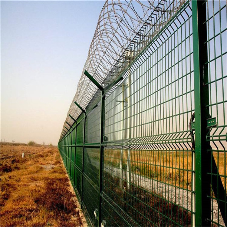 機(jī)場(chǎng)圍界網(wǎng)選用低碳鋼絲編制焊接而成,具有美觀、實(shí)用、方便運(yùn)輸和安裝的特點(diǎn)。在機(jī)場(chǎng)護(hù)欄網(wǎng)的橫向加裝四道折彎加強(qiáng)筋,在整體成本增加不多的同時(shí),使網(wǎng)面強(qiáng)度和美感顯著增加,是目前國內(nèi)外比較受歡迎的產(chǎn)品。彎即增加美觀性,同時(shí)增加網(wǎng)片強(qiáng)度,兩者兼得:頂部增加50CM“V”型角多配合刀片刺繩使用,更增加防攀爬和安全性能;自動(dòng)交叉焊接而成,焊點(diǎn)整潔無損傷,防腐性極強(qiáng),焊點(diǎn)牢固:表面外理方式成熟:PF&PVC材料具有無毒無害,防腐 防老化抗曬 耐高、低溫等特點(diǎn),產(chǎn)品結(jié)構(gòu)簡練、美觀實(shí)用、便于運(yùn)輸、安裝,防盜性能好,受實(shí)際地形限制小,對(duì)于山地、坡地、多彎地帶適應(yīng)性強(qiáng),成本適中,適合大面積采用。