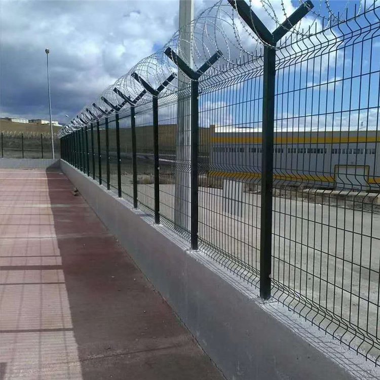 機場圍界網的國際標準,圍界網片及V型網的網孔其相鄰橫絲間距不得大于10cm,豎絲間距不得大于5cm,機場圍界網片與立柱之間的縫隙不得大于2cm,網片離地間距不得大于2cm。焊接圍界網片的鋼絲直徑必須大于等于5mm。機場圍界的立柱應采用60*60mm方管制成,管壁厚度不得低于2mm,立柱及網片的表面防腐年限不能低于8年。艾瑞機場圍界網頂部安裝的刀片刺網直徑在500mm、600mm、700mm,刺圈間距20-25cm。機場鋼筋圍界網的立柱基礎應采用現澆混凝土制成,截面500*500mm,高度800mm。