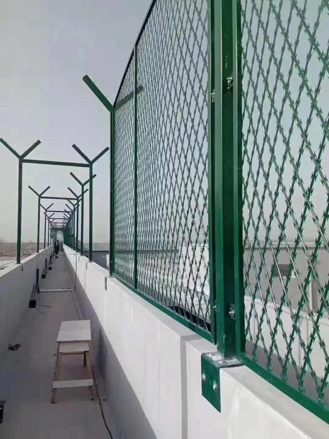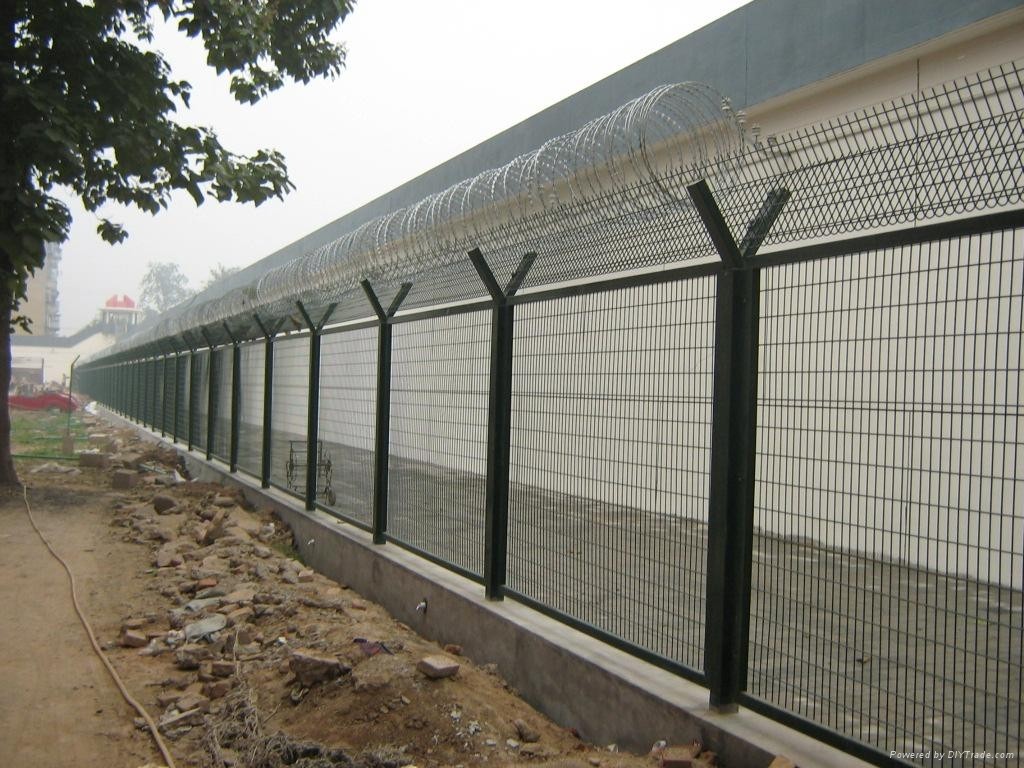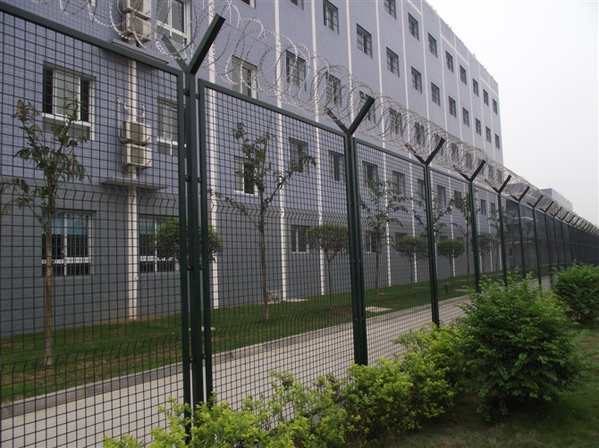 監獄護欄網又稱監獄安全網或監獄隔離柵,主要是采用度的刀片刺網與熱鍍鋅防護網,監獄防護欄,由V型支架立拄,監獄防護欄制造,加強型焊接片網,安全防盜連接件和刀片刺網組成.刀片刺網是一種新型防護網,由銳利尖角鍍鋅鋼板或不銹鋼薄板做刀片,鋼絲做芯線組合而成的防護器材. 一般采用304不銹鋼或熱鍍鋅材料組成,可以防雨淋,防銹,監獄防護網刀片刺網具有嚇阻、防翻越等效果,造型設計特別,不宜觸摸,因而能達到的防護隔離效果。監獄隔離網片一般由熱鍍鋅加噴塑而完成,經久、耐用。監獄護欄網還具有施工簡便,經濟實用等優點. 于監獄看守所、哨所、邊防、圍禁區域、軍事防御防護等高危險地區的防護。
