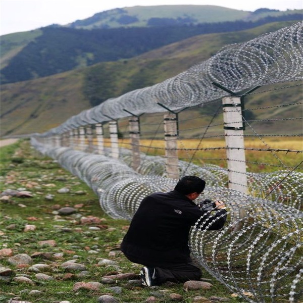 邊防是國(guó)家行為,國(guó)家對(duì)邊防實(shí)施高度集中統(tǒng)一領(lǐng)導(dǎo),對(duì)處理邊防涉外事務(wù)的權(quán)限作出嚴(yán)格規(guī)定,中國(guó)的許多邊境地區(qū)都安裝了護(hù)欄或者鐵絲網(wǎng)產(chǎn)品,中國(guó)的邊境線蜿蜒漫長(zhǎng),安裝邊境線鐵絲網(wǎng)和邊境護(hù)欄是為了保護(hù)國(guó)土的完整性,這樣的鐵絲網(wǎng)產(chǎn)品可以有效防止外來(lái)人員隨隨便便的進(jìn)入我國(guó)邊境,也為邊境地區(qū)的老百姓設(shè)立了一道安全鐵絲網(wǎng)圍墻。那么一般我們采用什么樣的方式來(lái)保護(hù)我們的呢?常用于刀刺網(wǎng),刀刺網(wǎng)分為好幾種Φ500、Φ600、Φ800圈徑,可以跟立柱連接,拉上刺繩,在拉上刀刺網(wǎng),根據(jù)高度上下幾圈都可以。