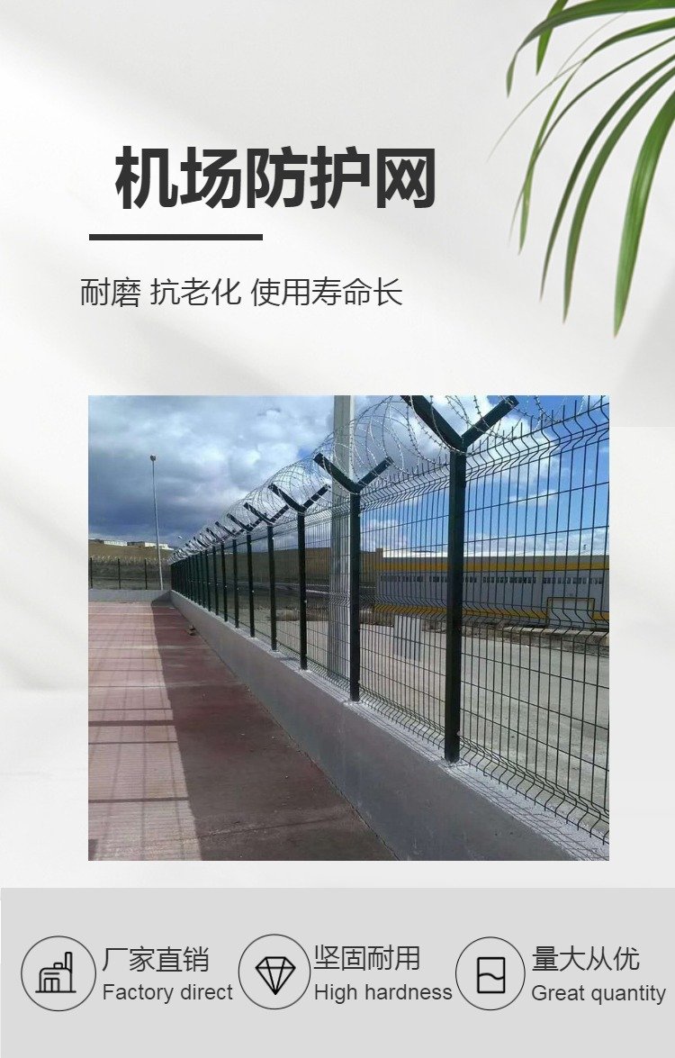 機場飛行區(qū)圍欄應(yīng)用于機場跑道兩側(cè)的隔離網(wǎng),作用是防止行人誤入跑道,影響飛機正常運行的有效措施。這個機場圍欄也分為機場內(nèi)隔離與機場外隔離,機場內(nèi)隔離的要求更高,頂部設(shè)置刀刺網(wǎng),外隔離就比較簡單一些,主要還是防止閑雜或者違法人員進入飛行禁區(qū),盡管這雙重保護之下,還是會有人進行每天巡邏,以防止個別情況發(fā)生。機場圍界廣泛應(yīng)用于各大飛機場的邊界,用作邊界圍欄防護網(wǎng),還可以用于港口圍界防護、碼頭鋼絲防護網(wǎng)、飛機場防護護欄網(wǎng)、Y型安全防御護網(wǎng),也可以用于公園、動物園、賓館酒店、市政道路等周邊的安全防護圍網(wǎng)。