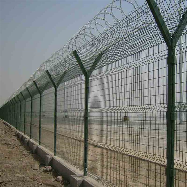 特點:如果在機場圍欄網頂部加裝刀片刺絲、刀片刺繩后又很好的增強了安全防護性能。采用電鍍、熱鍍、噴塑、浸塑等防腐形式,具有很好的抗老化、抗曬、耐候等特點。既起到圍欄作用,又起到美化作用。由于具有安全性高、防攀爬能力好,網片連接方式采用特制SBS緊扣件,有效防止人為的破壞性拆卸,橫向四道折彎加強筋,使網面強度顯著增加。當然我們安裝護欄的意義是即美觀,又可以防止人員和小動物亂入影響飛機的正常飛行。