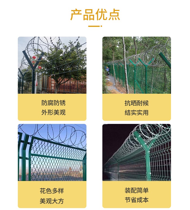 3.網(wǎng)片頂部橫桿,采用專用連接件與不銹鋼螺栓在立柱頂部連接。并在V字型延伸臂上鋪設(shè)刺絲滾籠,沿長度方向每隔500mm用4個卡子連接。連接螺栓均為304不銹鋼。